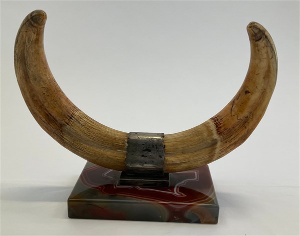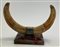 Trofeo con corna fissate da una fascia d'argento incisa con paesaggio mediorientale su base in pietra dura (l cm 23) (difetti)
