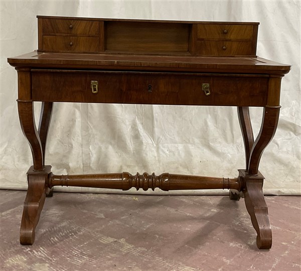 Scrittoio lastronato in noce con piano in pelle con alzata a cassettini e vano. Fascia a un cassetto, gambe e piedi sagomati riuniti da traversa tornita. Secolo XIX (cm 113 x100x64) (difetti)