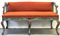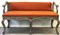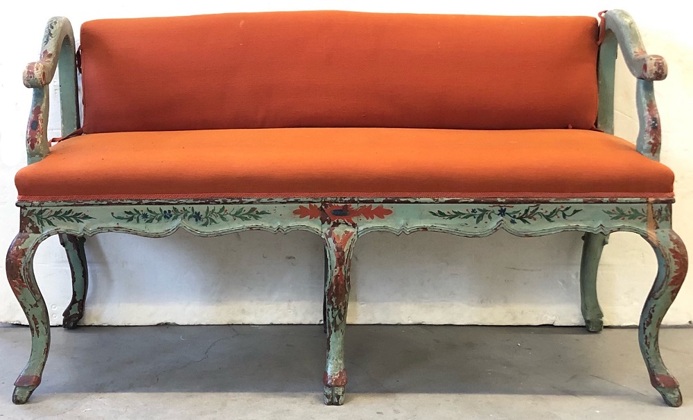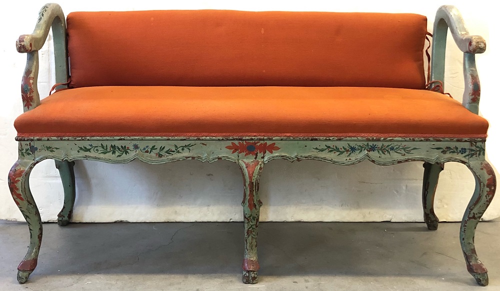 Coppia di divani di forma mossa in legno intagliato, laccato e dipinto a foglie e fiori. Secolo XVIII. Seduta e schienale imbottiti e rivestiti in tessuto color arancione (cm 135,5x82x52) (difetti e restauri)