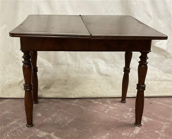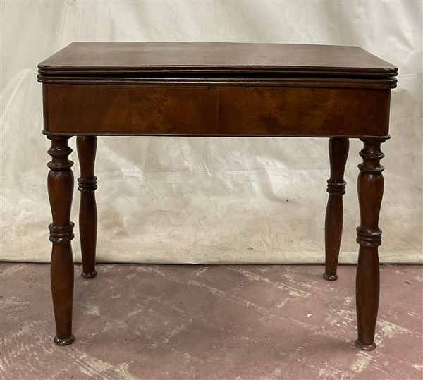 Tavolino da gioco lastronato con piano a libro, gambe tornite. Secolo XIX (chiuso cm 87x43x73,3) (difetti)
