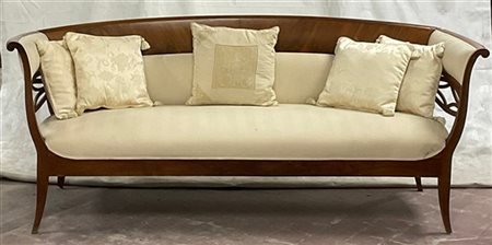 Divano lastronato con braccioli traforati terminanti a ricciolo, gambe mosse. Secolo XIX (cm 209x88x71,5) (difetti)