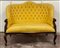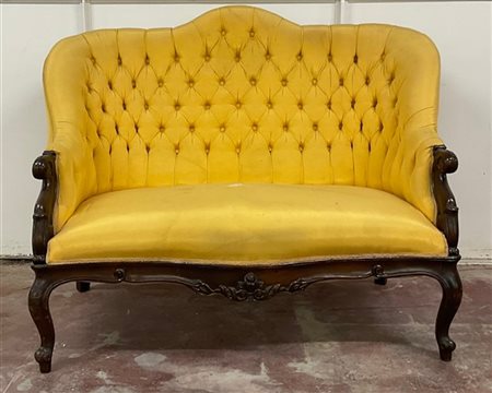 Divano in legno intagliato di forma mossa, braccioli e gambe a ricciolo (lungh. cm 136) (difetti e restauri)