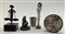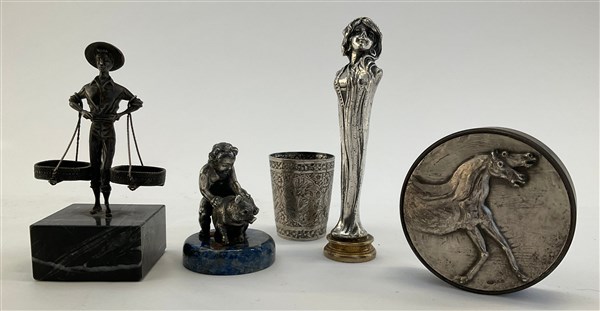 Lotto composto da due sculturine in argento raffiguranti un pescivendolo e un fanciullo con maiale, un presse papier con placca in argento raffigurante cavalli, un bicchierino in metallo inciso e un sigillo Liberty in metallo con figura femminile (h max cm 10) (lievi difetti)