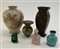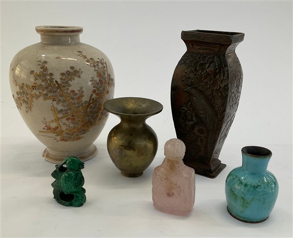 Manifatture orientali differenti, lotto composto da un vaso in ceramica Satsuma, un vasetto in metallo sbalzato con fiori e uccelli, un vasetto in metallo inciso e uno smaltato, uno snuff bottle in quarzo rosa e una sculturina in malachite (h max cm 15) (difetti)