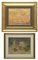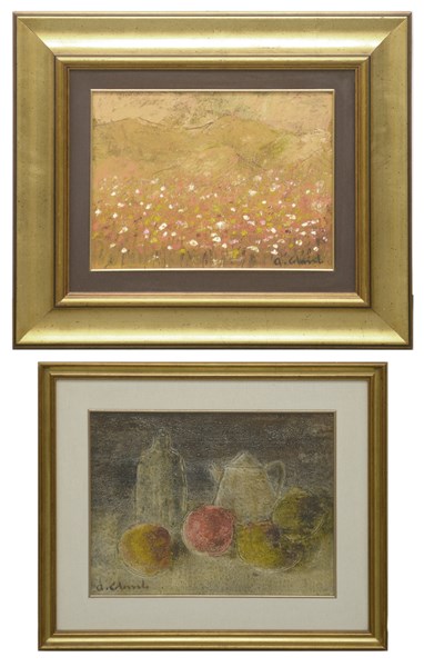 Lotto composto da due tecniche miste su masonite raffiguranti paesaggio e natura morta (cm 29x39) firmate in basso