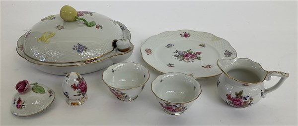 Manifattura di Herend. Lotto composto da uno scaldavivande, una lattiera, una saliera e tre oggetti differenti in porcellana decorata in policromia (difetti)