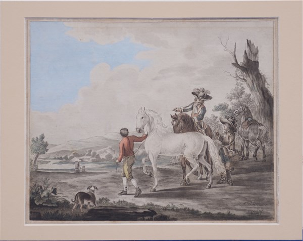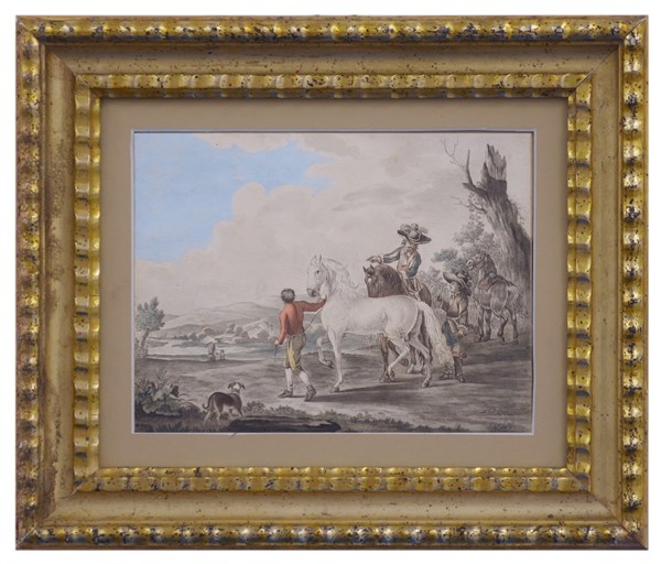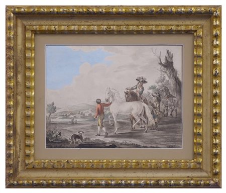 Firma indecifrata "Paesaggio con figure e cavalli" acquarello (cm 23x28) firmato in basso a destra, in cornice