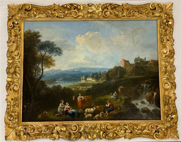 Scuola dell'inizio del secolo XIX, "Paesaggio con pastori e armenti", olio su tela (cm 72x94). In cornice (difetti)