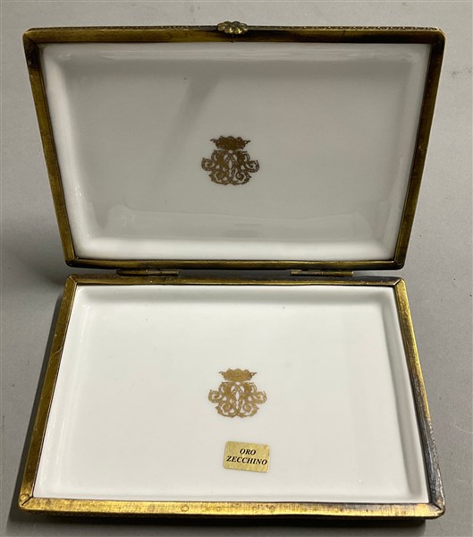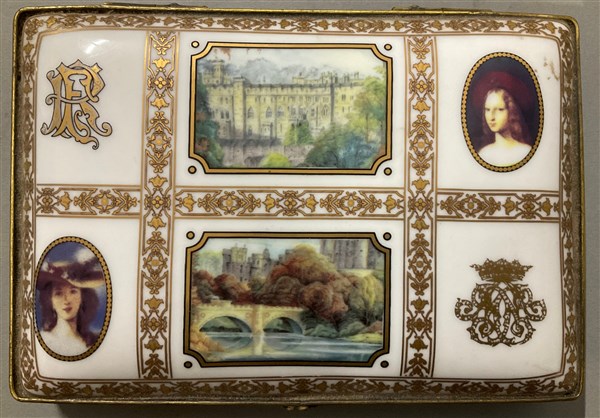 Scatola in porcellana dipinta in policromia con paesaggi e ritratti femminili,