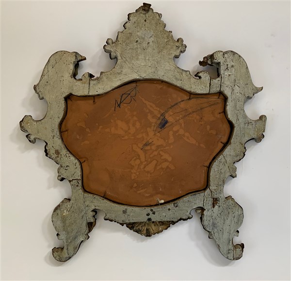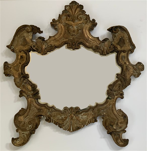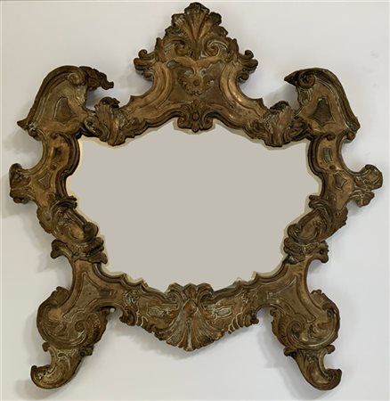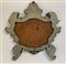 Cartagloria in legno e lamina di rame sbalzato, decorato a foglie e volute.(cm 60x63) (difetti e mancanze)