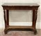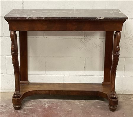 Console in mogano con montanti anteriori sagomati, intagliati a forma di teste di cigno. Piano in marmo. Secolo XIX (cm 103x90x42) (difetti)