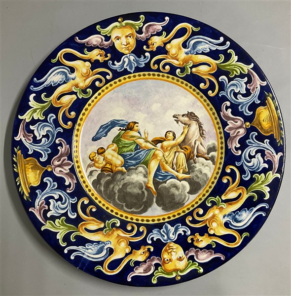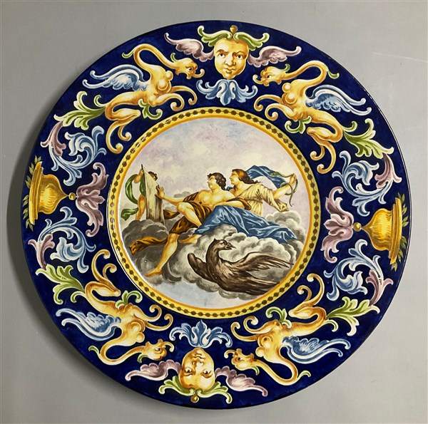 Manifattura italiana, coppia di piatti da parete in maiolica decorati a motivi rinascimentali e scene mitologiche in policromia (d cm 60)
