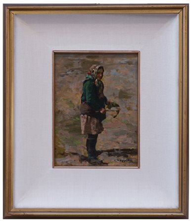 "La contadina" olio su compensato (cm 20x15) Firmato in basso a destra. Al retro: titolato e firmato. In cornice