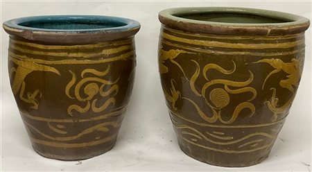 Due vasi da esterno in ceramica decorati con draghi Cina, sec XX (h max cm 48)