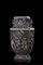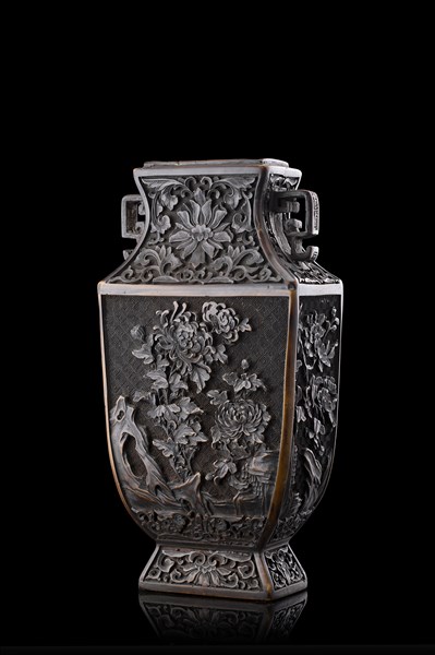 Vaso biansato rettangolare rivestito in resina bruna con decoro floreale (difetti)