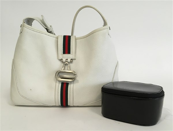 Lot comprising a white leather bag with a fabric band and a small black leather vanity case (minor defects, wear)