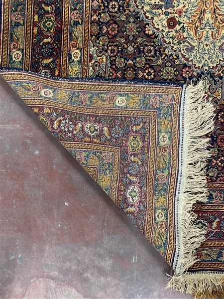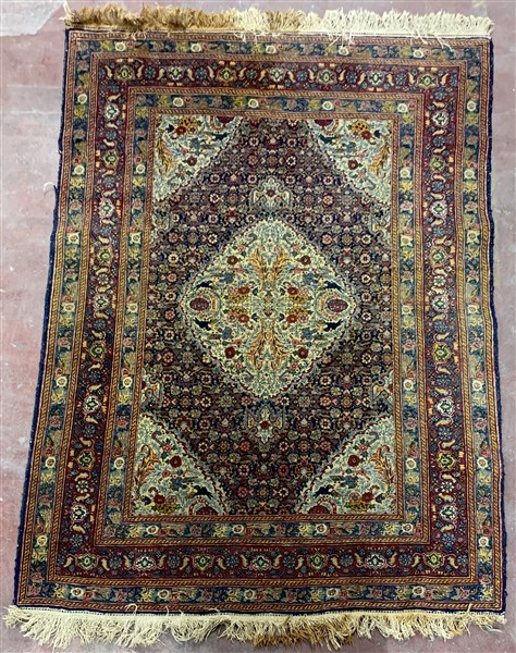 Tappeto Ardebil, Persia, secolo XX. Decoro con medaglione a fondo bianco con volatili e rami fioriti su campo blu notte ornato da motivo Herati. Angolari a fondo bianco con volatili e rami fioriti. Bordura Herati su fondo ciclamino (cm 196x137) (lievi difetti ed una macchia alla testata)