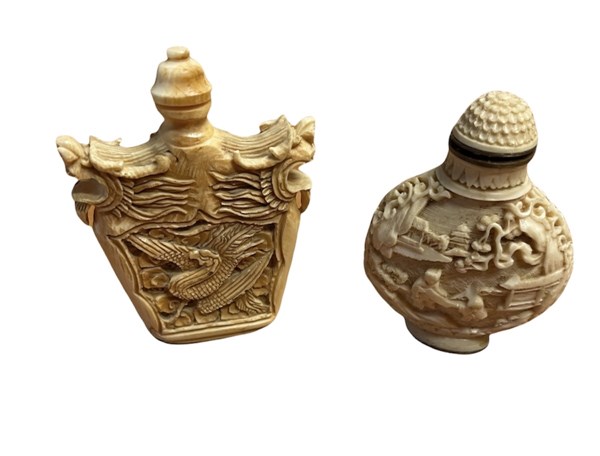 Due snuff bottles in avorio/osso di cui una a forma di vaso biansato con teste