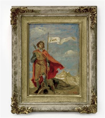 "San Bovo e il saraceno" 1933, olio su cartone (cm 35x25) Firmato e datato in basso a destra. In cornice (difetti)