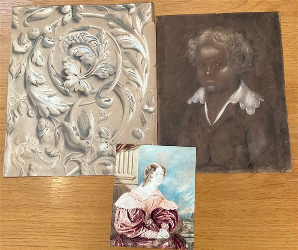 Lotto composto da un disegno a pastelli raffigurante fanciullo (cm 40x31), un disegno raffigurante fregio ornamentale (cm 43,5x37) e un disegno ad acquerelli raffigurante dama (iscritto in basso) (cm 23,5xx19,3)