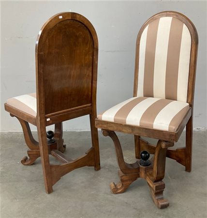 Coppia di sedie con struttura in legno e gambe anteriori sgomate a volute; seduta e schienale rivestiti in tessuto a righe bianche e beige. (cm 45x100x48) (lievi difetti)