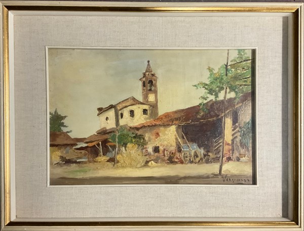Vergani "Paesaggio con cascinale e chiesa" olio su compensato (cm 30x46) Firmato