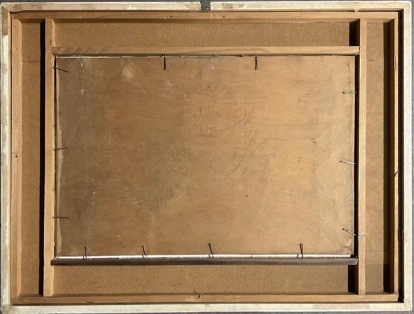 "Paesaggio con cascinale e chiesa" olio su compensato (cm 30x46) Firmato in basso a destra. In cornice