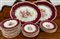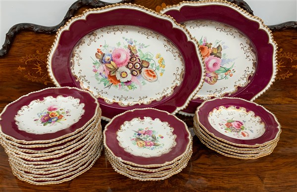 Manifattura inglese Chamberlain & Co, Worcester, fine secolo XIX, servizio di piatti in porcellana dipinta a decoro floreale con fasce bordeaux e oro, composto da ventotto piatti piani, diciotto fondi e due fiamminghe (difetti)