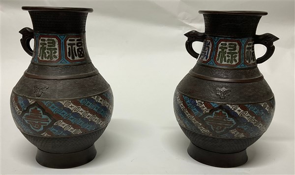 Coppia di vasi biansati in bronzo e metallo cloisonnè. Giappone, inizio sec. XX (h. cm 30) (difetti e mancanze)