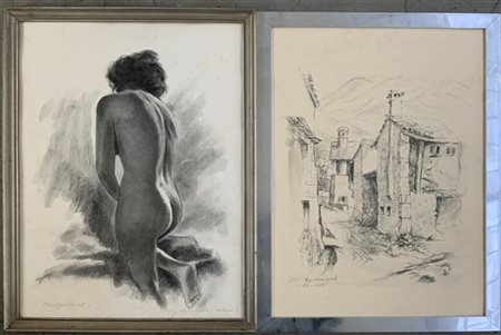 Lotto di tre disegni a carboncino di soggetto e dimensioni diversi, in cornice