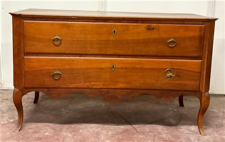 Cassettone in noce con fronte a due cassetti, fascia intagliata, gambe mosse. V