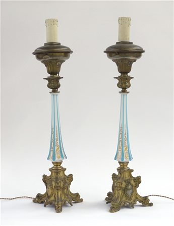 Coppia di lampade fusto in opaline decorato a dorature con aironi e volute , base tripode in bronzo dorato e cesellato a volute, secolo XIX (h cm 72) (montati a luce elettrica in epoca posteriore)