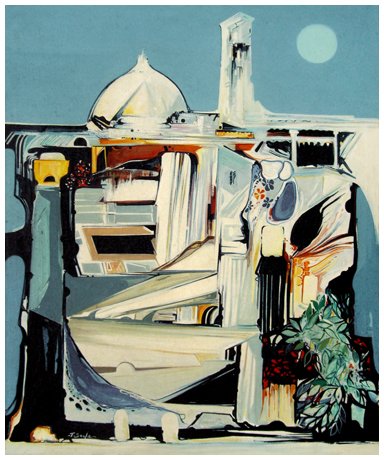 TEMISTOCLE SCOLA Livorno 1942 (Cattedrale) Composizione 1976 Olio su tela 60 x 50. Firma in b. a s.; sul verso titolo, data, tecnica e firma + timbri studio dell’artista.