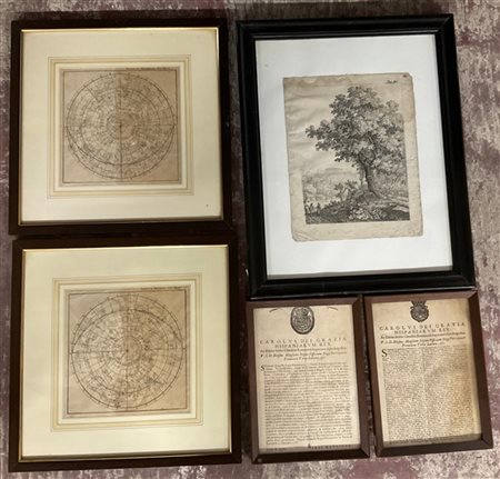 Lotto composto da due mappe astrali e due grida del secolo XVIII ed una antica incisione raffigurante paesaggio, misure diverse, in cornici