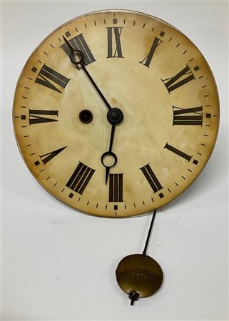 Movimento di orologio a pendolo con quadrante circolare a numeri romani. Inizio secolo XX (d cm 24,5) (difetti e mancanze)