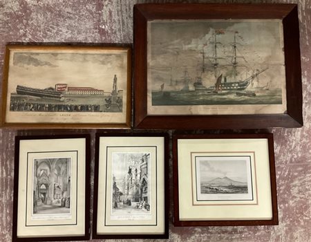 Lotto composto da due litografie a colori raffiguranti velieri, due litografie raffiguranti interno di Cattedrale ed una raffigurante scorcio con il Vesuvio, autori e misure diverse, in cornici