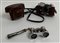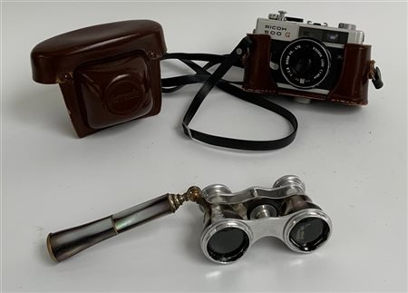 Macchina fotografica modello "Ricoh 500 G" in custodia originale in cuoio unita ad un binocolo da teatro in metallo marcato Otto Schleiffelder Optiker (difetti)
