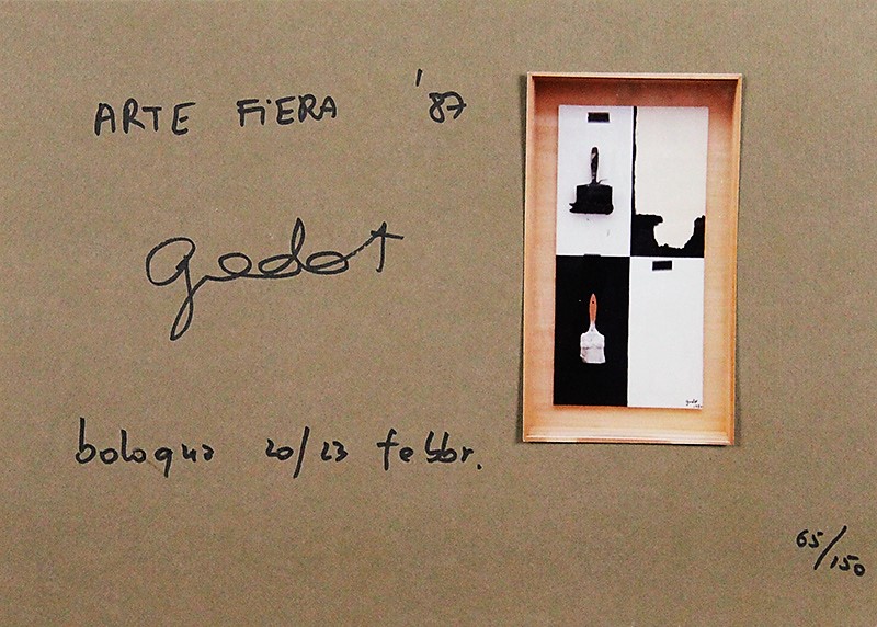 MAURIZIO GODOT VILLANI, "Arte fiera '87", 1987, Tecnica mista su cartoncino, Dim. 25x35, Al fronte: titolo, scritta: Bologna 20/23 febbr. firma ed esemplare n° 65/150, Opera senza cornice