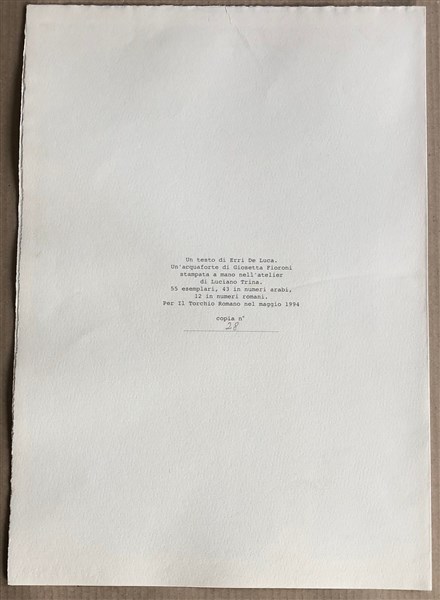 stampata su foglio doppio con poesia di Erri De Luca, firmata da entrambi gli autori in basso; numerata al retro 28/55