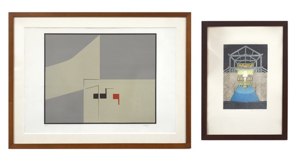 Lotto composto da una litografia di Arturo Bonfanti "Casa Magica" 1977 (cm 48x68), numerata 38/100, firmata e datata in basso a matita e un'acquaforte di Arduino Cantafora "Fuochi urbani" 1978 (foglio cm 49x34) titolata, numerata 86/100, datata e firmata in basso a matita
