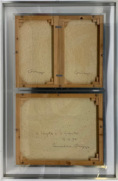 firmato in basso a destra; firmato al retro su tutte e tre le tele e dedica del 1974. In cornice (difetti)