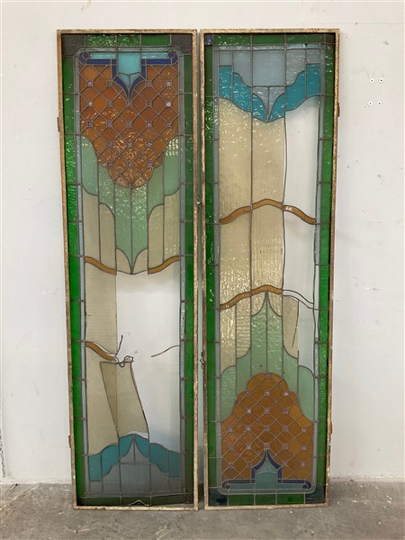 Coppia di vetrate con vetri policromi legati a piombo. (cm 50x180 ca,) (gravi d