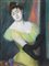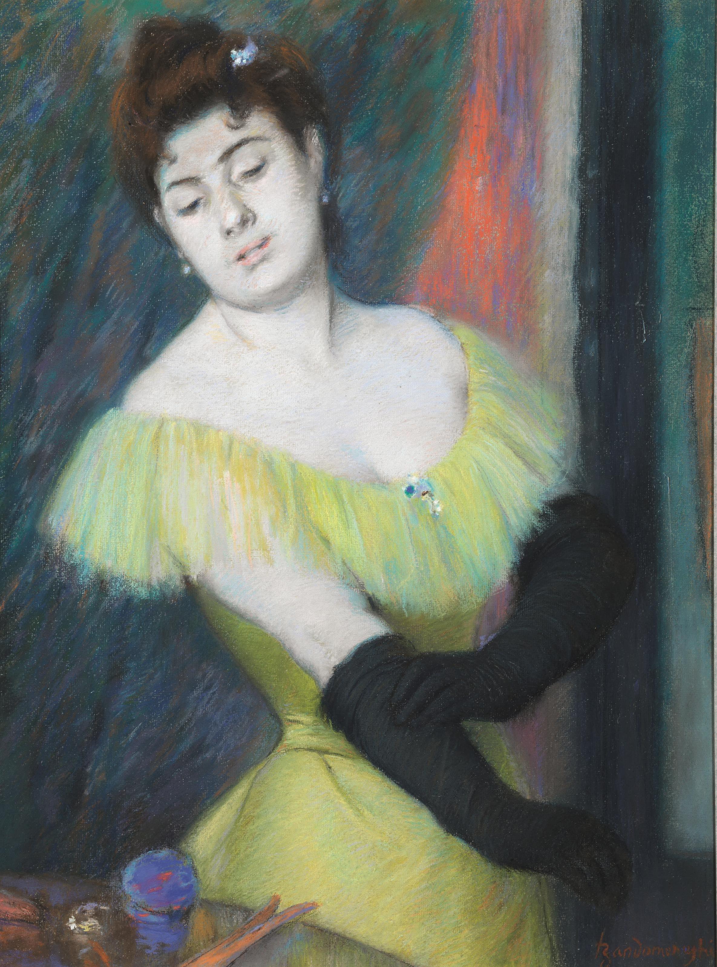 Nella composizione qui presentata, gli oggetti si riflettono sulla superficie lucida di un tavolino. La protagonista del dipinto, vestita di uno splendido abito giallo, è colta nell’atto di sfilarsi un paio di lunghi guanti di neri. Il gesto le è così consueto che sembra farlo in modo distratto, come assorta nei propri pensieri. Si tratta proprio di una di quelle “pagine di diario” che narrano “un momento di vita […] immagine tenera e luminosa d’una piccola società” - metafora coniata dal critico Enrico Piceni per descrivere la splendente intonazione di molti celebri quadri di Zandò. Eppure, a ben guardare, non si tratta di un momento di rilassata intimità quotidiana. La posizione degli oggetti, il forte verticalismo dello stipite, e soprattutto quella sequenza ascendente di colori primari (blu, giallo, rosso) conferiscono all’intera composizione un ritmo nervoso e assai moderno come del resto è moderno il taglio dell’opera, nella quale si percepisce appena sulla destra il frammento di una cornice, e dove l'inquadratura scelta dal pittore tronca il tavolino e gli oggetti su di esso appoggiati. Quadri come questo rispondono alla necessità del “patron” di Zandomeneghi, il famoso gallerista e patrocinatore degli Impressionisti Paul Durand-Ruel, di trovare “un pittore di figure nuovo da imporre ai clienti” perché “Degas non produce più se non a sbalzi e a capriccio, Renoir fa lo stesso…”, come spiegò lo stesso Zandomeneghi all’amico Diego Martelli in una lettera del 9 ottobre 1894.