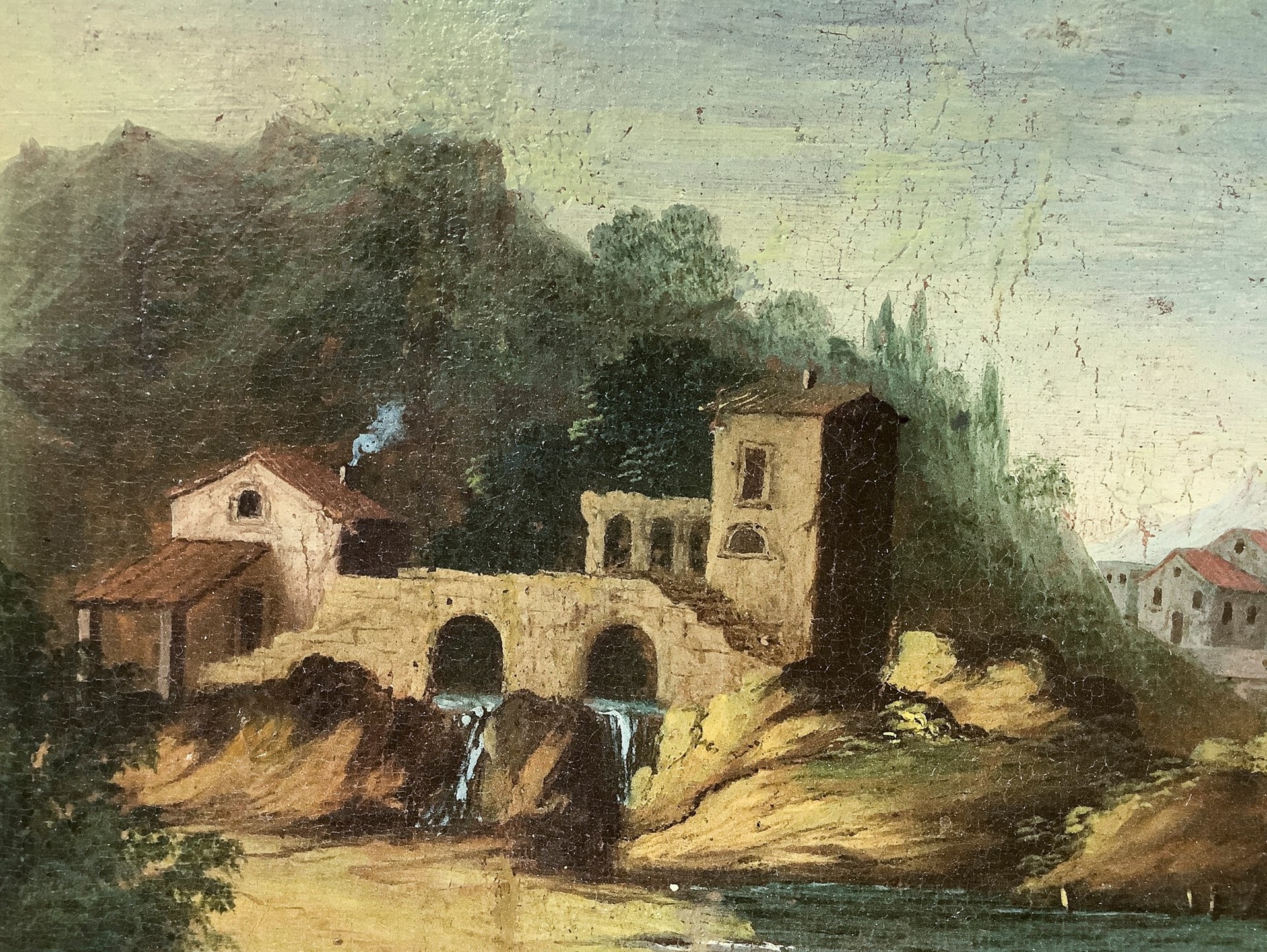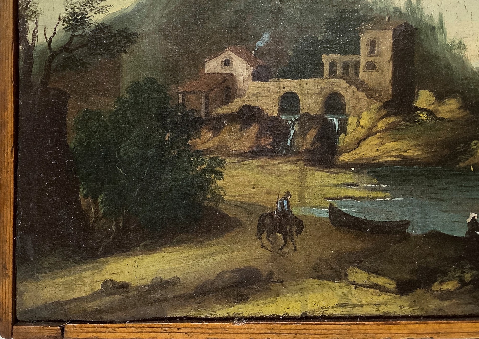 Giuseppe Zais (ambito di) (Forno di Canale 22/03/1709-Treviso 29/12/1781) - Paesaggio con case, barche e personaggi, XVIII century cm 19,5 x 29,5 Olio su tela
