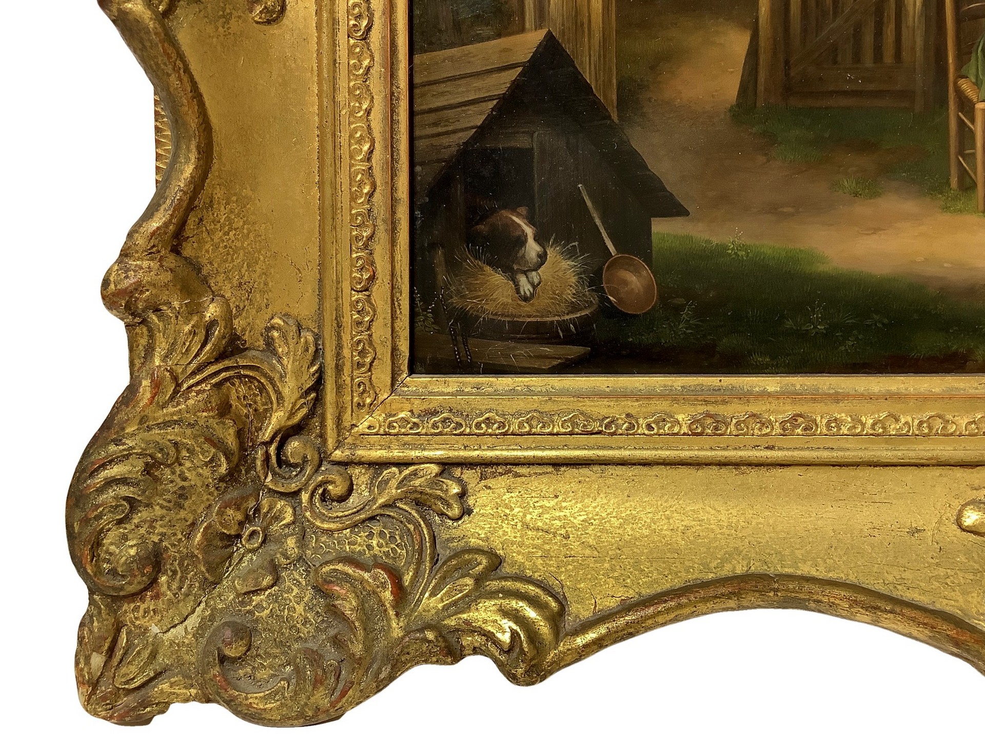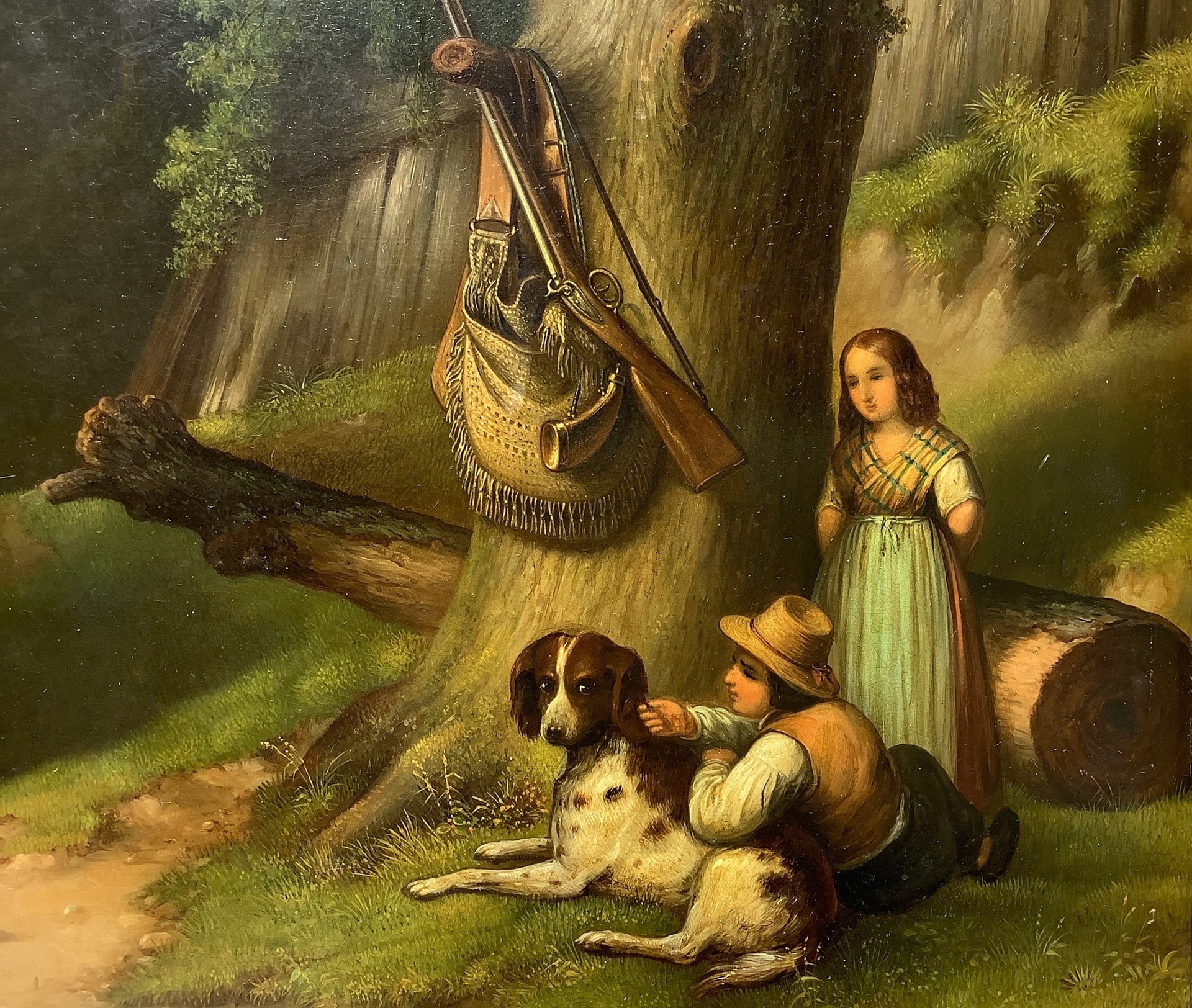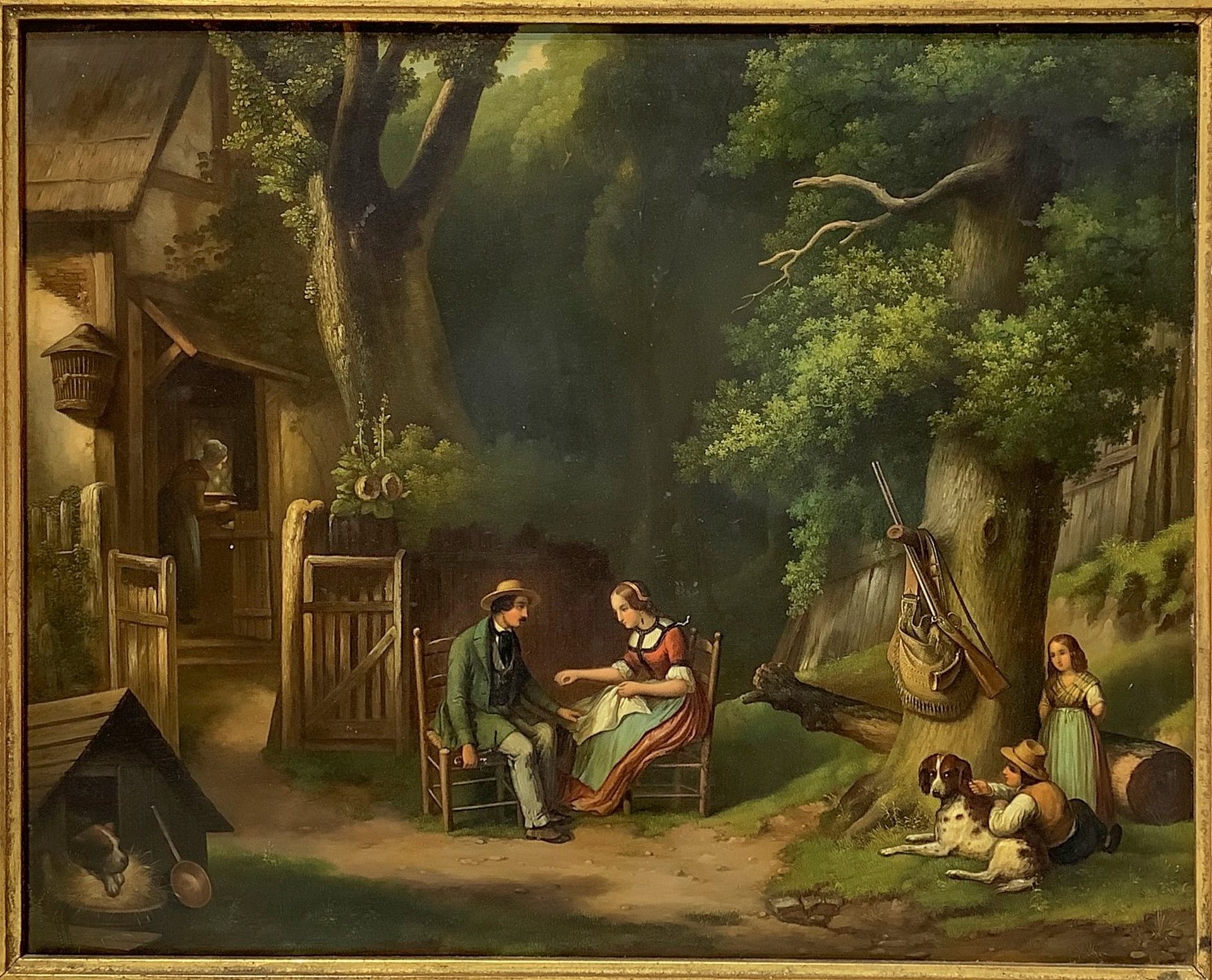 Scena familiare all'aperto con bambini e cane, nineteenth century 31x38 cm, 42x50 cm Dipinto a olio su rame pittore del XIX secolo.