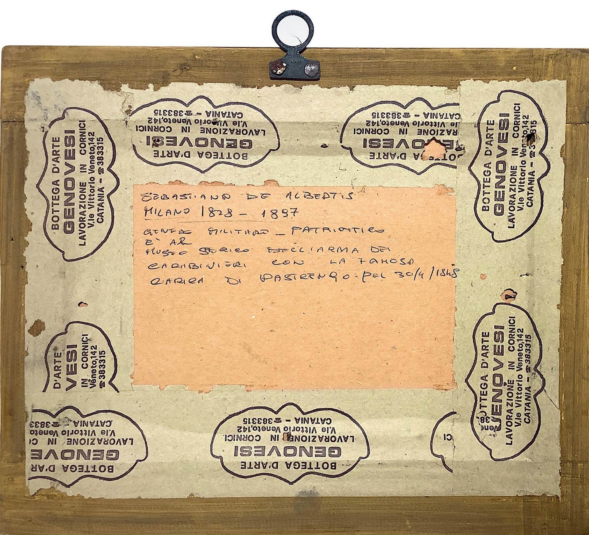 De Albertis, Sebastiano (Milano 1828-Milano 1897) - Carabinieri a cavallo e personaggi, nineteenth century 6,5x12,5 cm. In bella cornice in legno dorato 23x27 cm Acquarello su carta Pittore, frequentatore dell’Accademia di Brera, il cui repertorio è di genere militare-patriottico, di forte valenza civile. È presente al Museo Storico dell’Arma dei Carabinieri con il famoso dipinto “La Carica di Pastrengo” (1848).