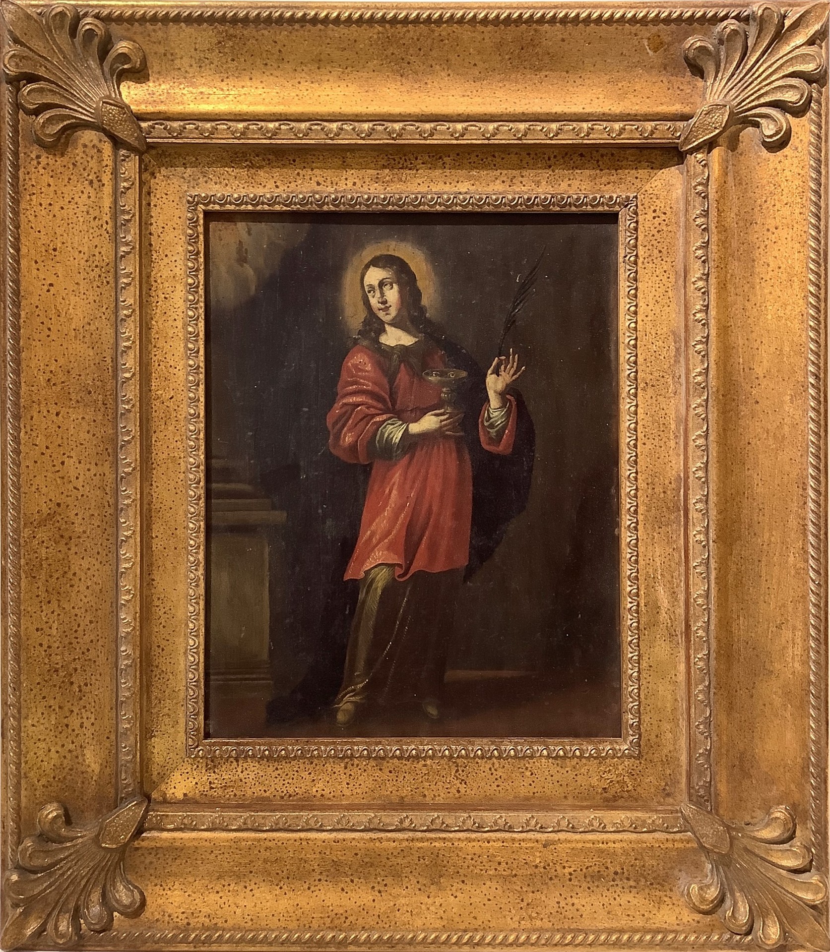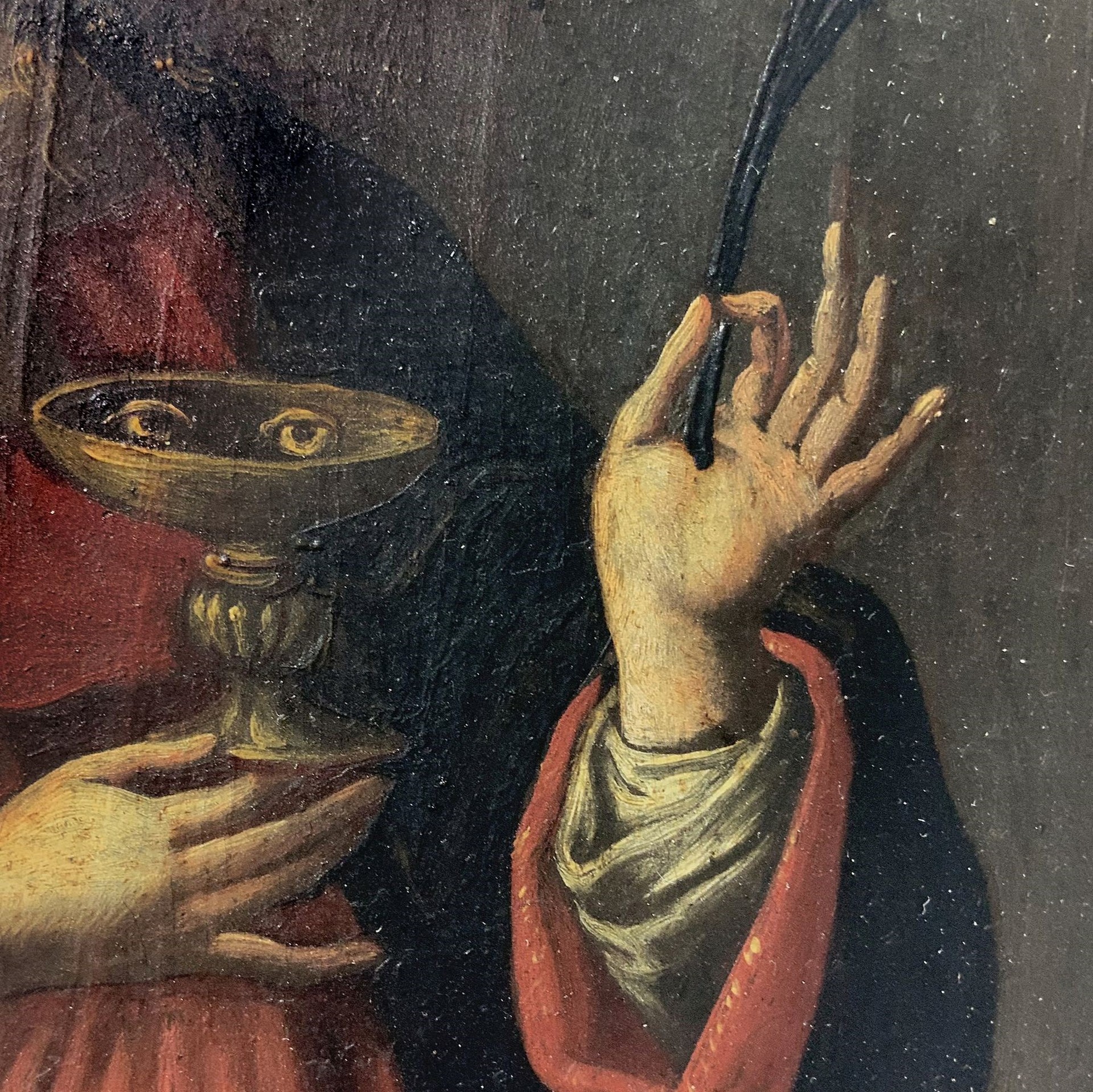 Santa Lucia, XVIII Century 30x23 cm Dipinto ad olio su tavola Antica collezione Notaio Cav. Fazio. Superficie del dipinto risulta interessata dalla presenza di uno strato di vernice ossidata e ingiallita. Manca un pezzo di cornice