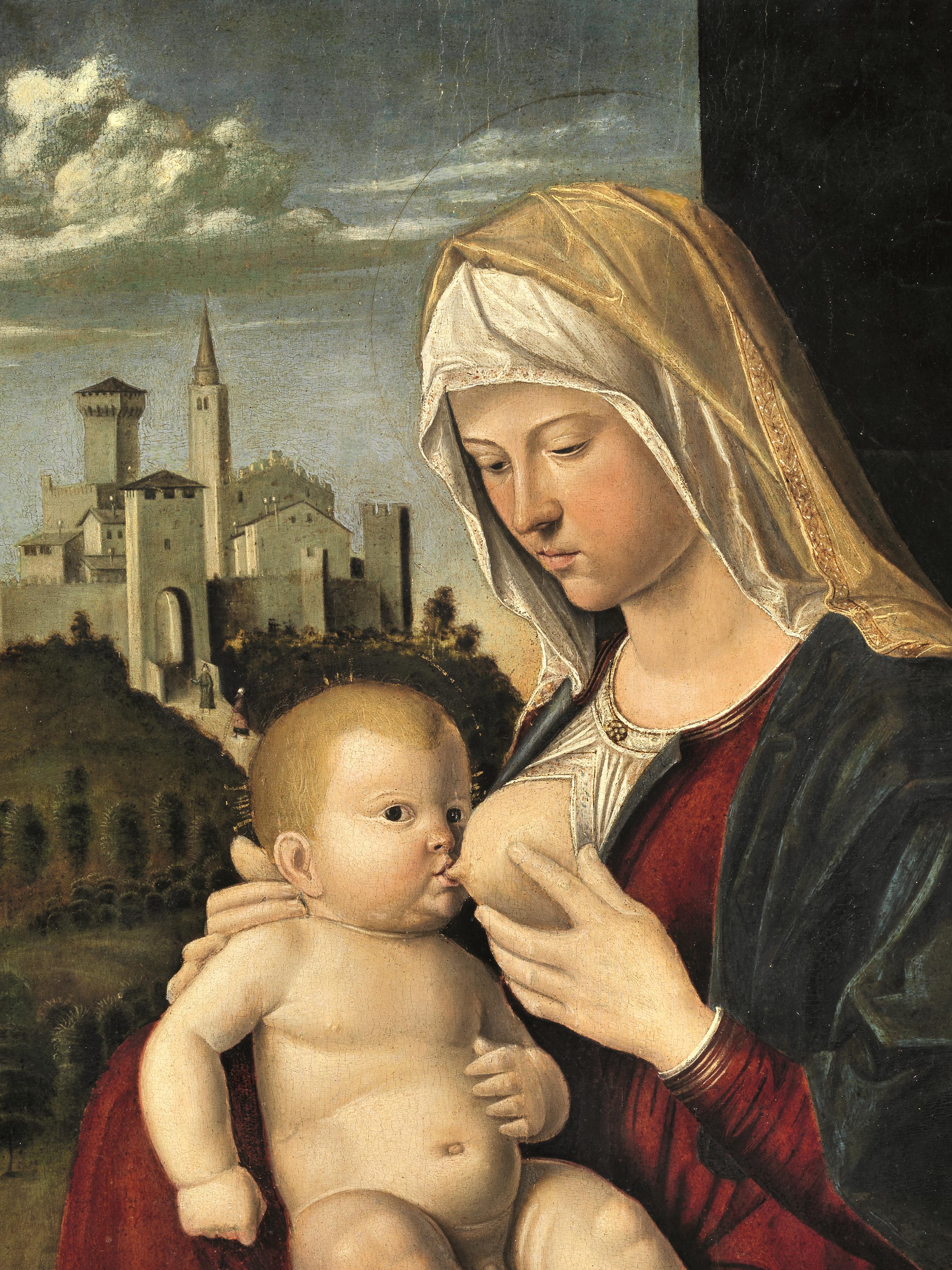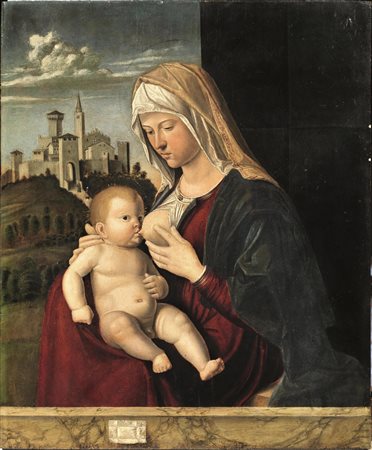 Raffigurata in atto di allattare il Bambino secondo un’iconografia senza precedenti nel catalogo dell’artista, la Vergine si staglia contro un tendaggio aperto parzialmente su un terso e cristallino paesaggio con borgo cittadino d’ispirazione belliniana. Cima, infatti, fu ampiamente influenzato da Giovanni Bellini dal quale riprese spesso talune composizioni o singole citazioni, come l’uso di un parapetto marmoreo, quale espediente formale utile a razionalizzare lo spazio e inquadrare le figure all’interno della composizione. Presente anche nel nostro dipinto, il parapetto reca un cartellino con iscrizione attualmente non leggibile ma verosimilmente recante un tempo il nome dell’artista. Cima mostra tuttavia una precisa autonomia di linguaggio: dissolve le ieratiche simmetrie belliniane lasciando spazio a una maggiore naturalezza e ad un’apparente casualità, come possiamo dedurre anche dal nostro dipinto in cui la Madonna viene rappresentata di tre-quarti nel gesto tenero e delicato di offrire il seno al figlio, quasi una moderna e ben più terrena Galactotrophousa.