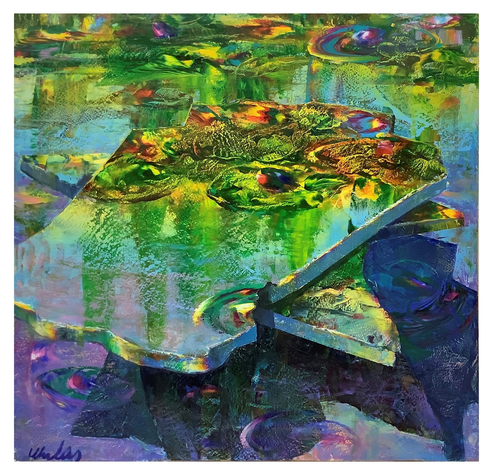 Mulas, Franco (Roma 30/08/1938) - Ninfee Cm 60x60, senza cornice Olio su tavola Firmato in basso a sinistra, firmato e titolato al retro. Autentica dell'artista su fotografia. Sprovvisto di cornice Questo lotto è soggetto a diritto di seguito