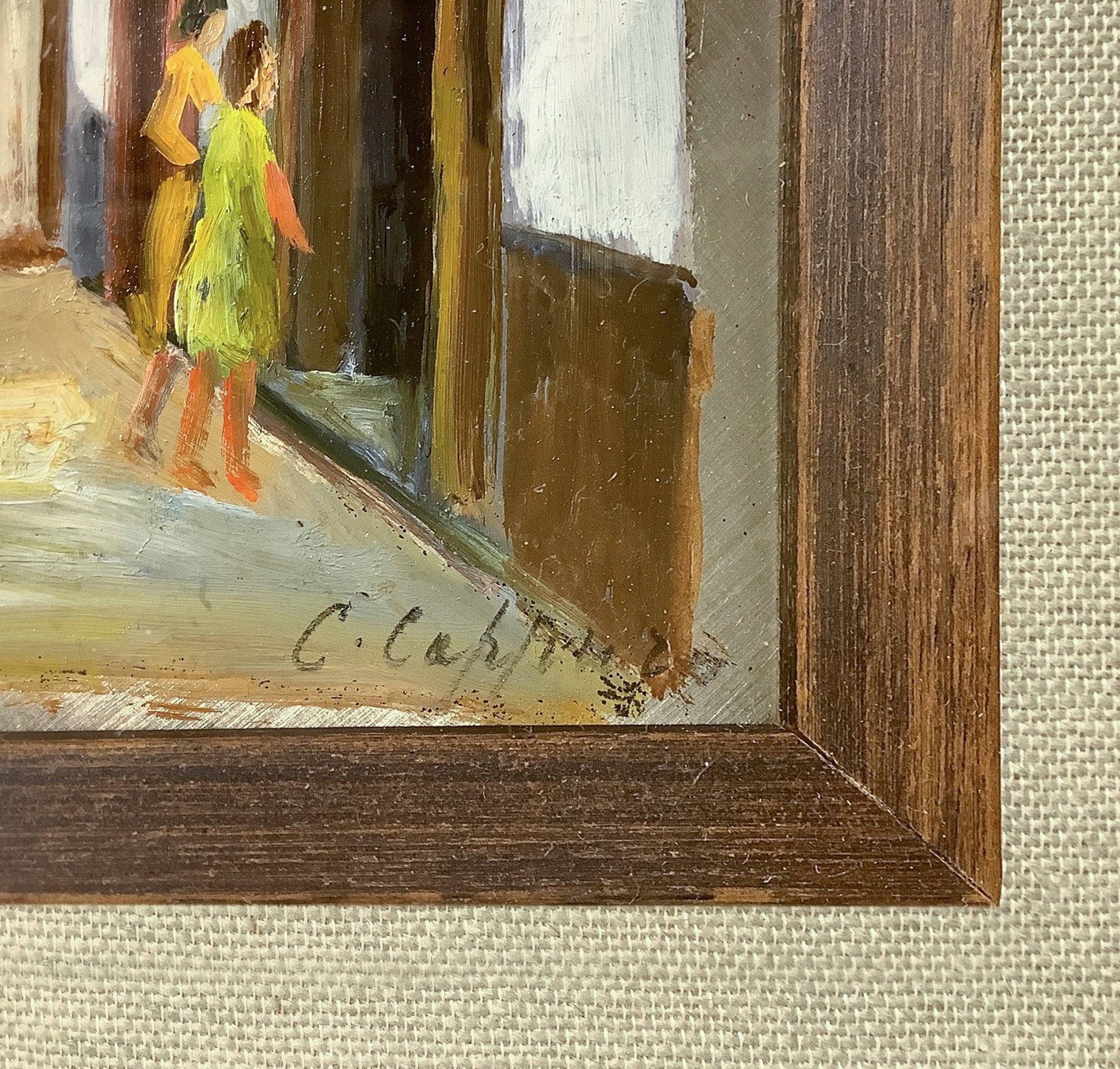 Personaggi in una strada in cornice 37x37 cm Dipinto a olio su lastra d'argento Firmato C. Cappuro.